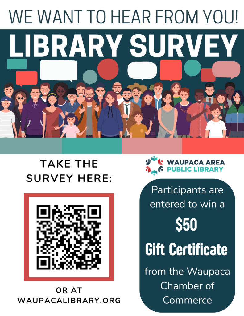 This survey includes questions about your library use, perceptions, and ideas for the Waupaca Area Public Library, and should take approximately 10 minutes to complete.